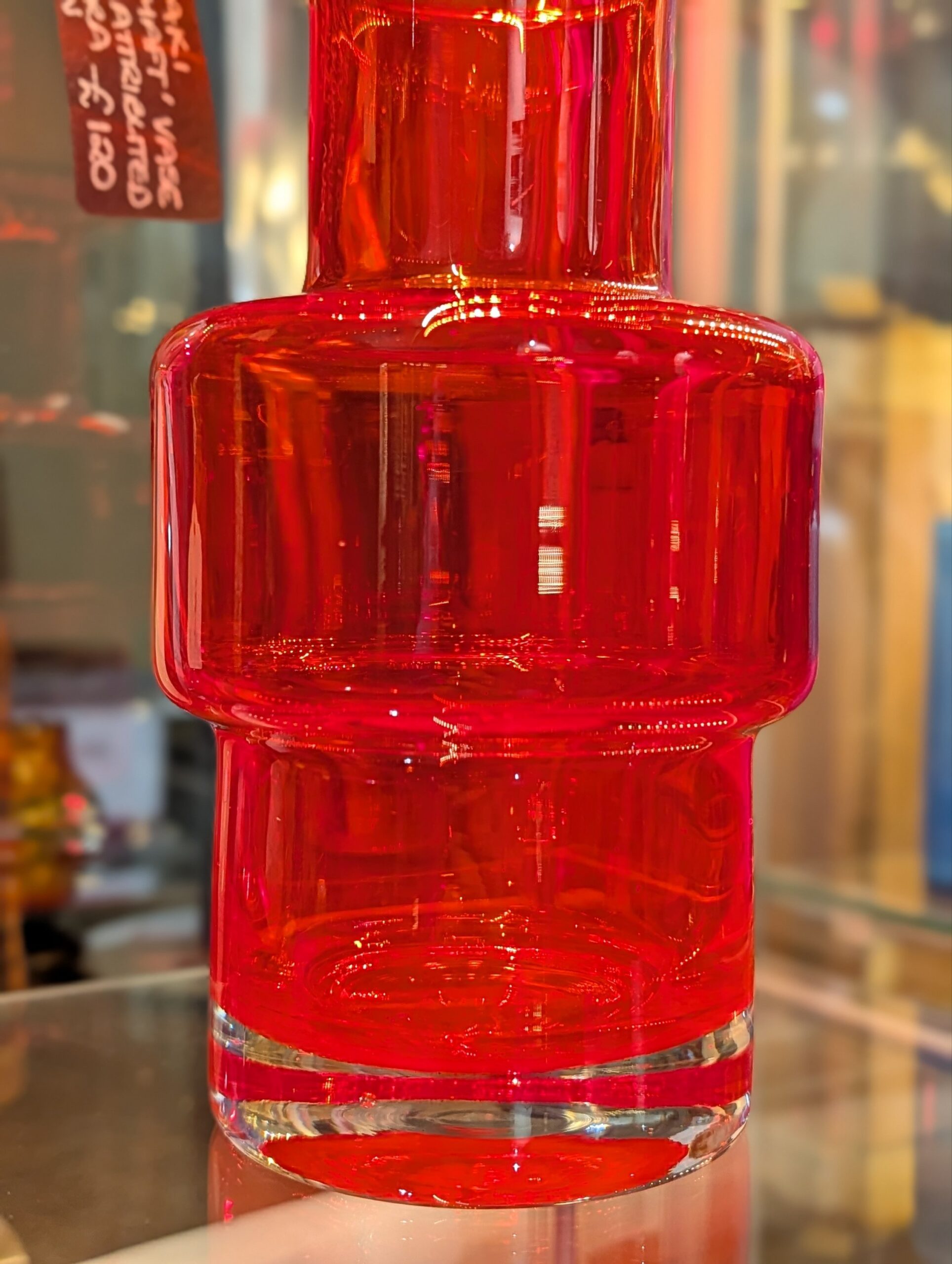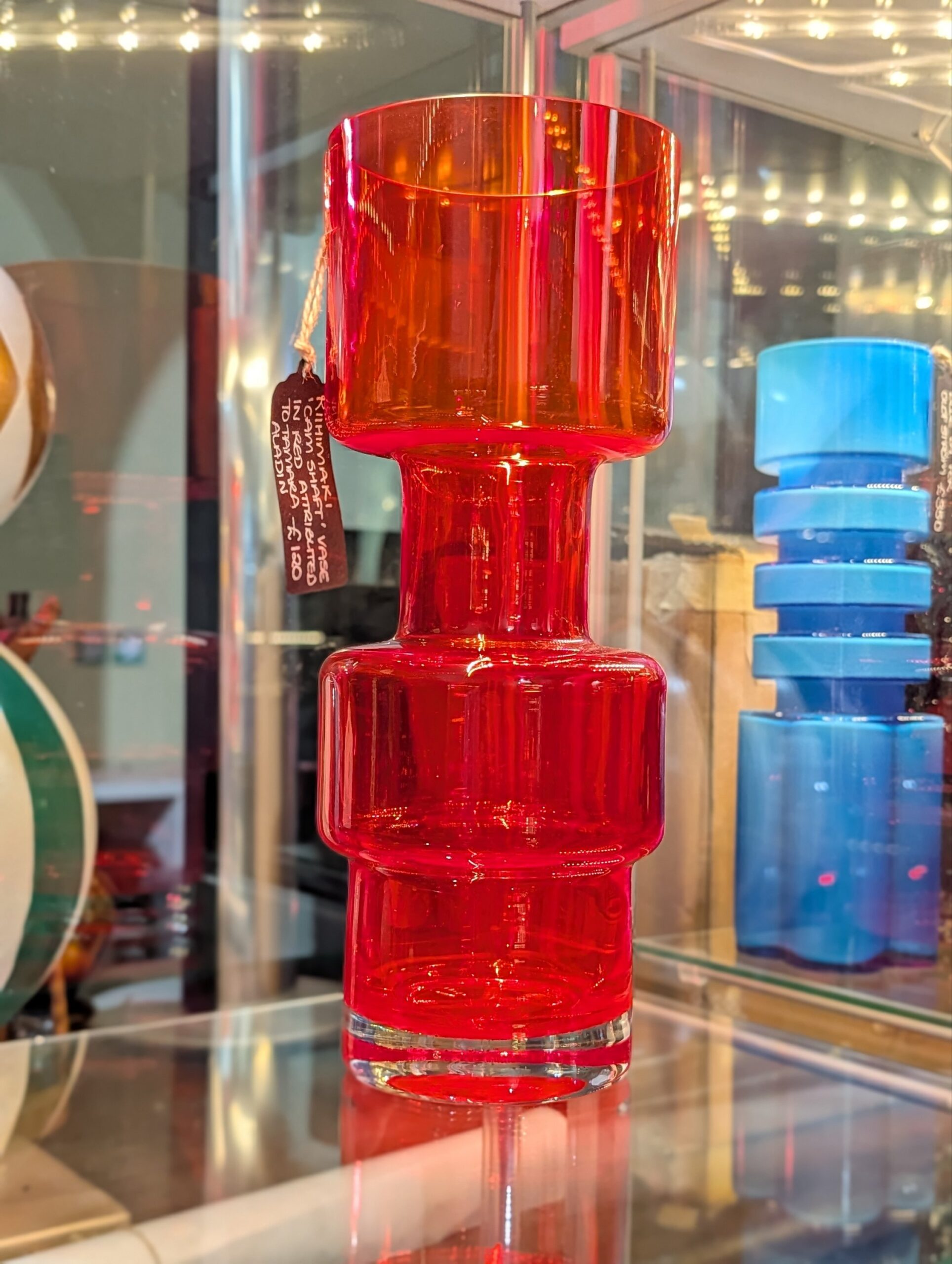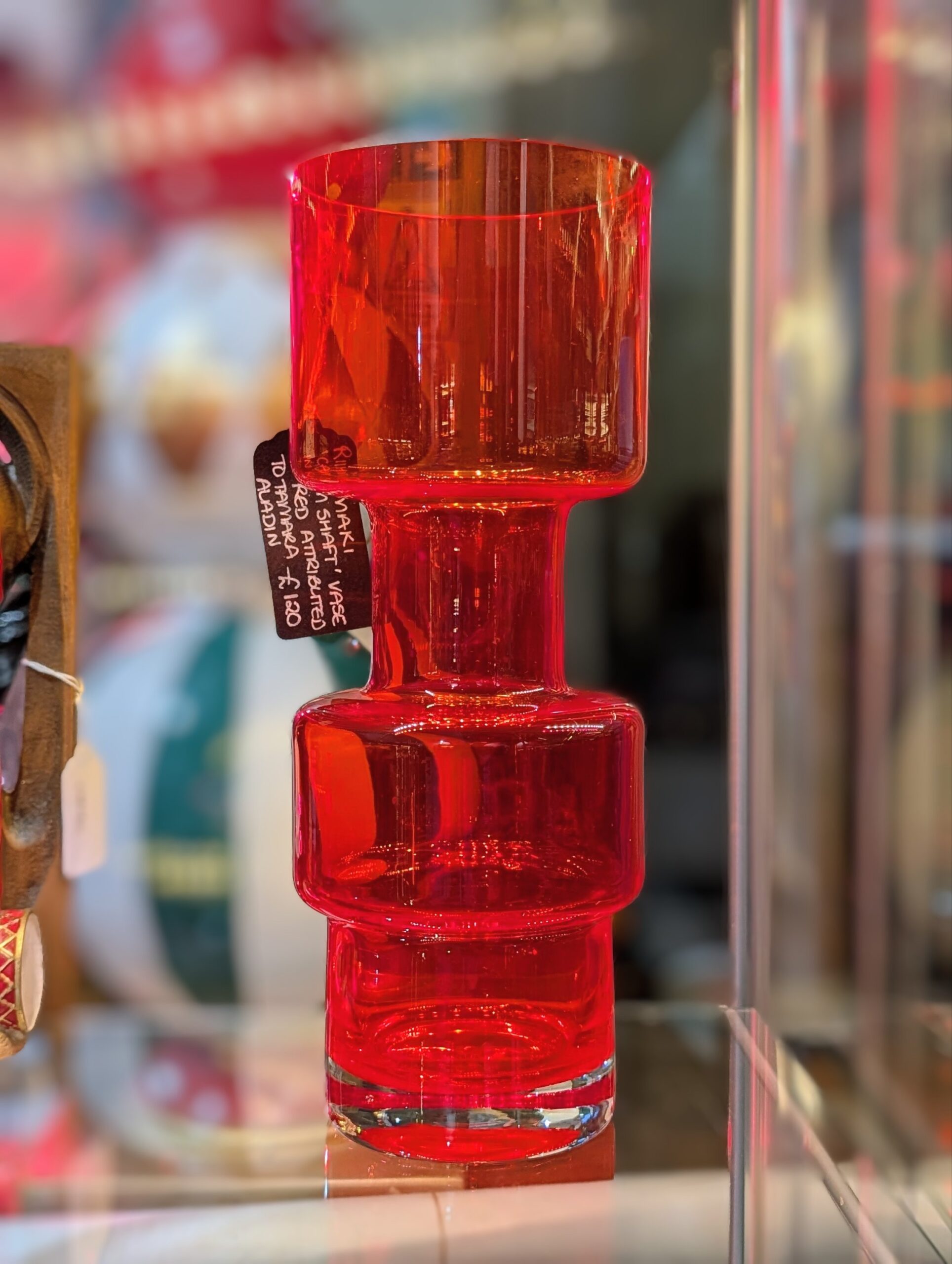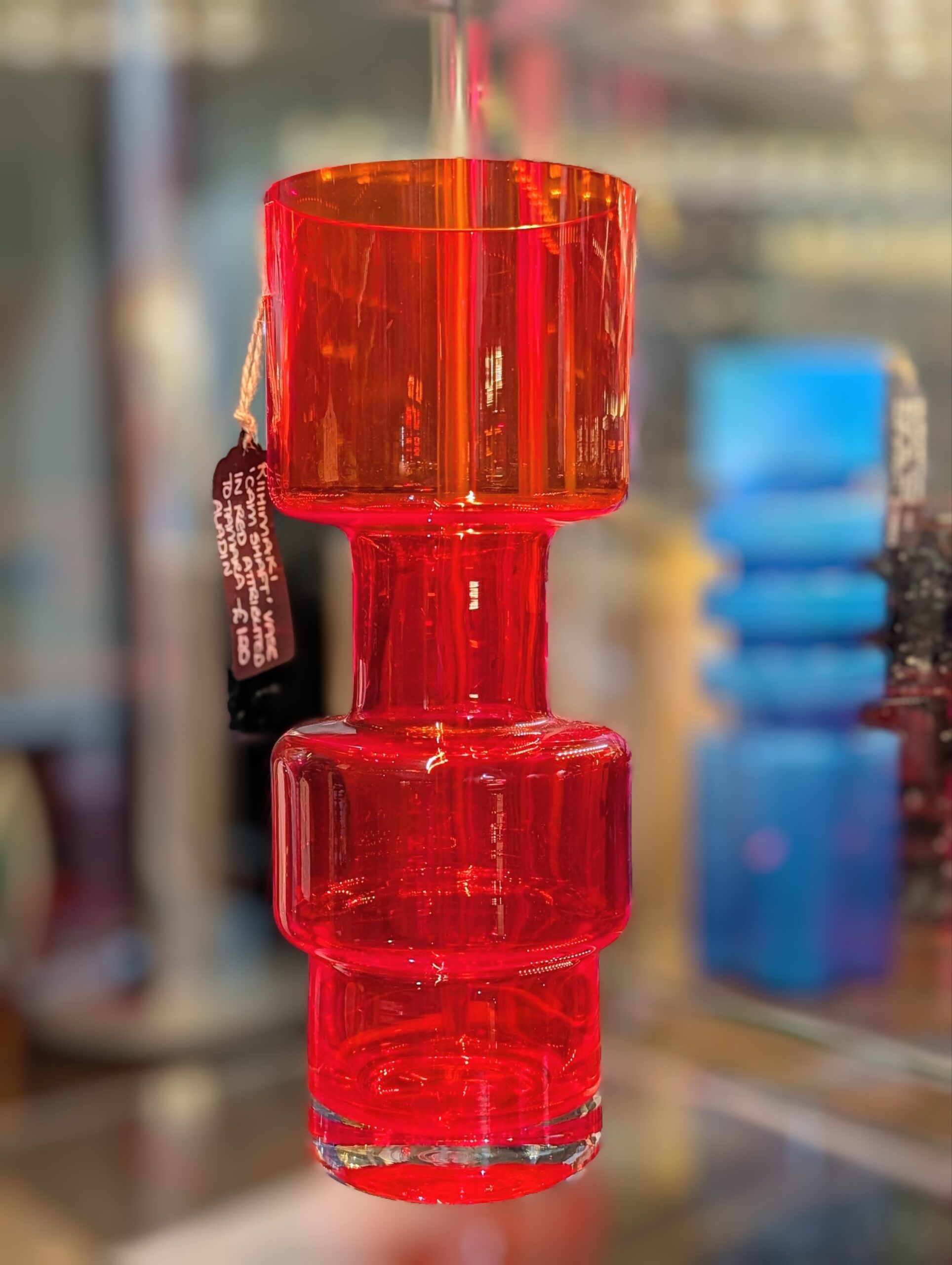 Executed in a vivid red glass, the vase features a bold stacked cylindrical profile with strong architectural presence and excellent clarity.